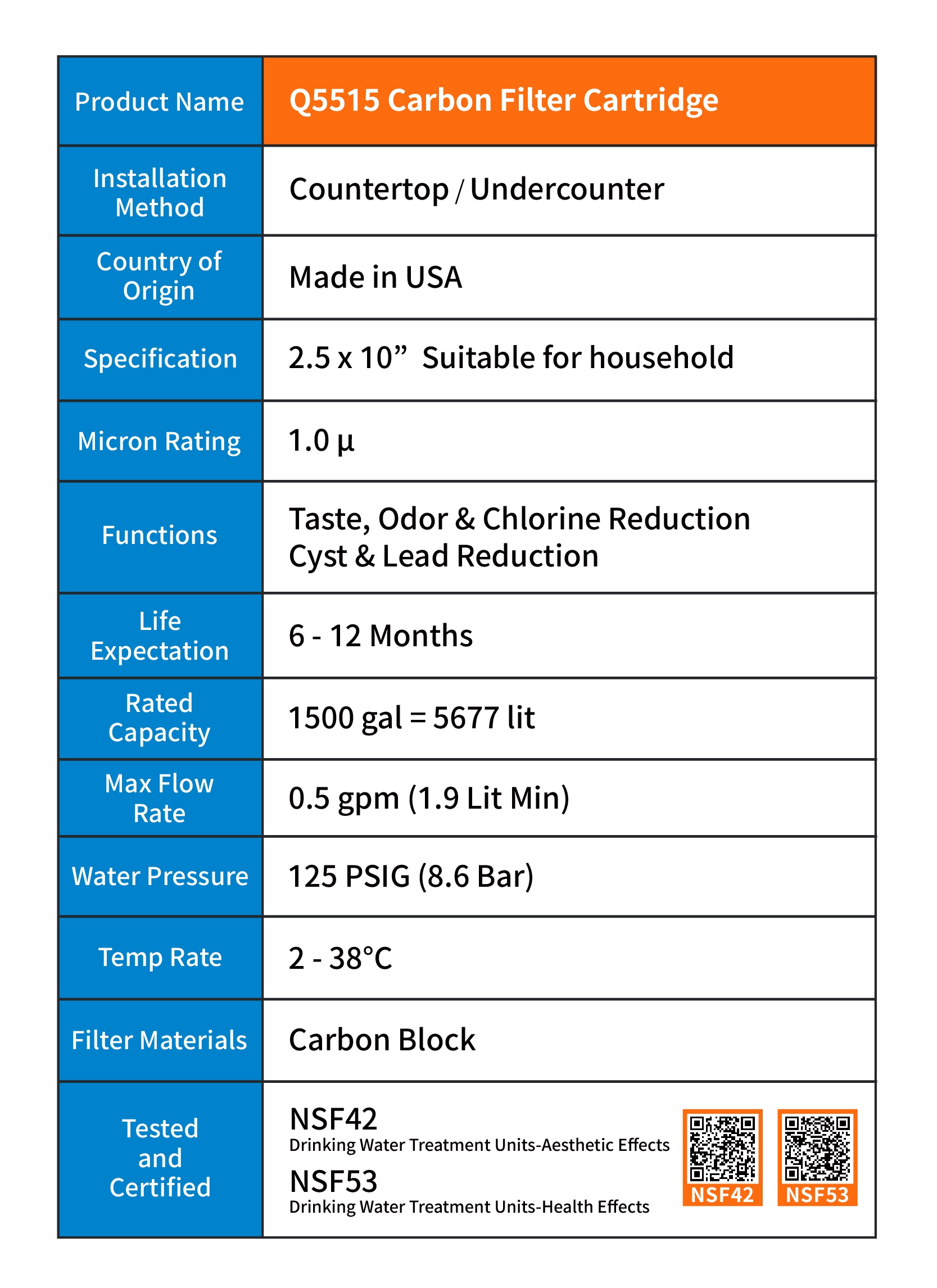 - NSF42 & NSF53 International Certified